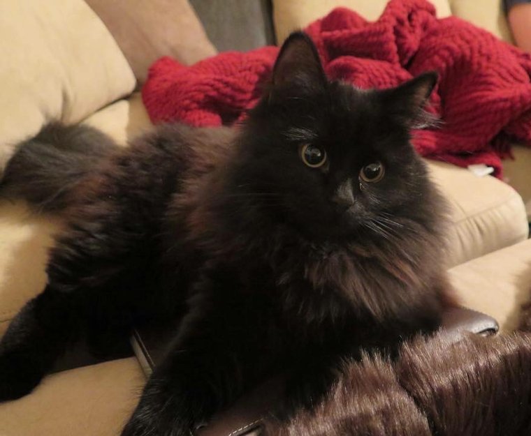 Liten og nett hunnkatt. Svart lang pels, med litt brunt skjær. Veldig tillitsfull og søker menneskekontakt.