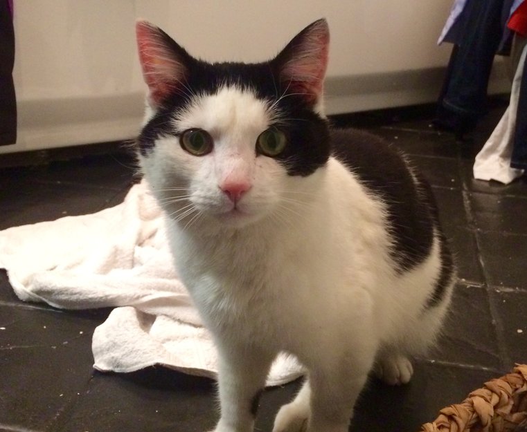 Veldig søt hannkatt med hvit og svart pels. Har rosa ører og snute. Er ikke en veldig stor katt og er ganske lett. Mjauer mye.