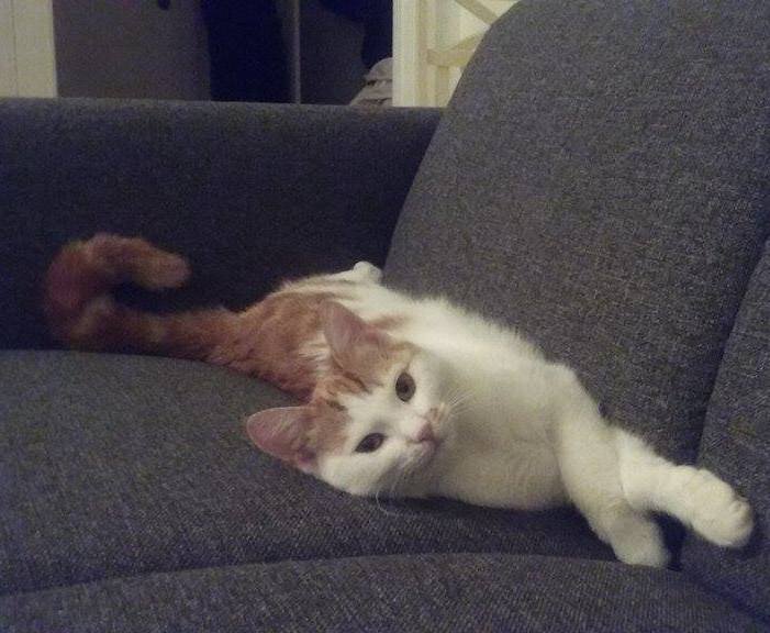 Ble borte rett utenfor hjemmet sitt, da han fikk gå fritt etter gradvis tilvenning med bånd. Er 7 måneder, og kan ha blitt skremt av biler, da området er tildels trafikkert. Tror han kan være i nærheten, men at han kan ha gjemt seg i garasjer, uteboder eller hekker der han har mulighet til å komme seg inn, eller andre hulrom han kan føle seg trygg.