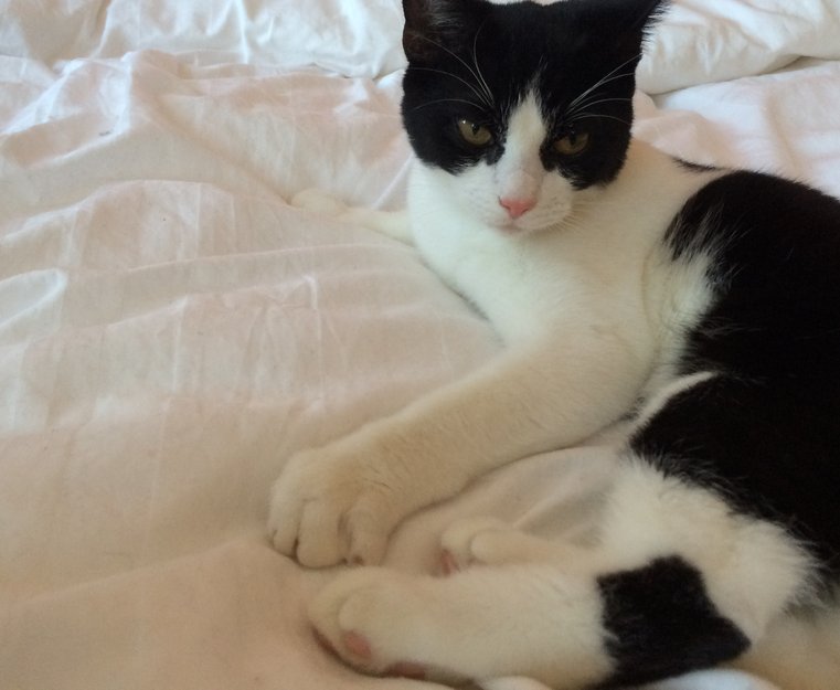 Ung katt. Svart på ryggen og hvit på brystet. Hvite tegninger i ansiktet. Hvite poter og hvit på tuppen av halen.