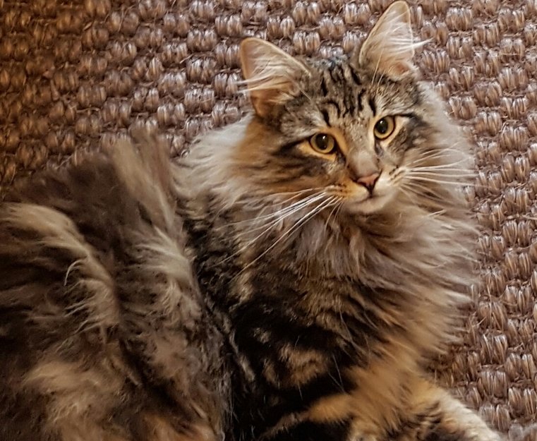 Moses kom ikke hjem i går morges, noe som er svært uvanlig for ham. Jeg har lett overalt, spurt naboer og undersøkt garasjer i flere runder men ingen respons. Han er en brun og lysstripet norsk skogkatt. Spesielle kjennetegn er krøllhalen hans, som ligger over ryggen. Han er svært savnet.