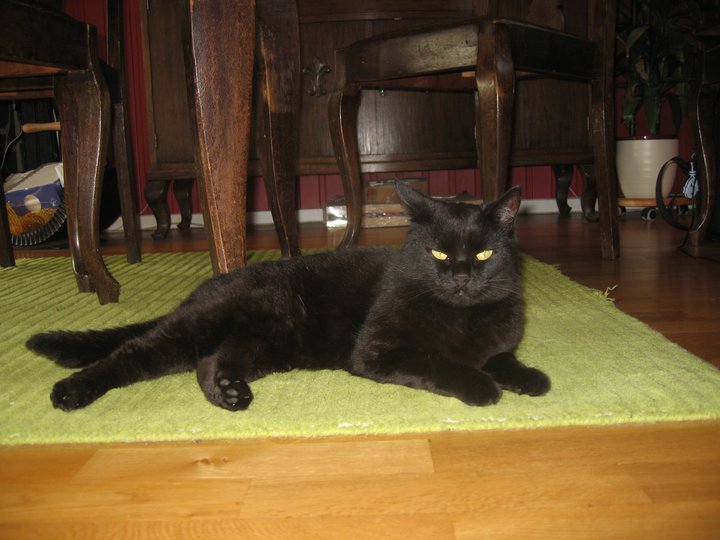 Ganske liten og helt svart jentepus. Veldig kosete men også litt svetten av seg.
