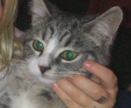 Den er ganske liten bare 22 uker og virket som den lyder navnet sitt THEO. Den er hvit midten av ansikt og et spesielt kjennetegn er at på den ene siden av nesen er sort og mens på den andre siden av nesen er den hvit. Hvite poter. Og litt sånn hvitt under halsen.