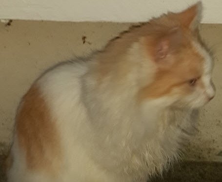 Nydelig ung hunnkatt ca 7 mnd. Hvit og orange langhåret og velstelt, tydelig menneskevant.
