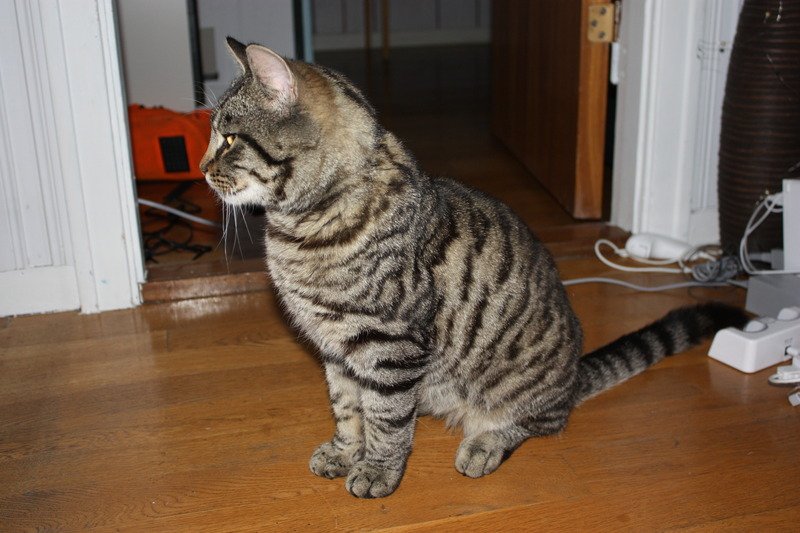 Litt kraftig hannkatt. Svært tillitsfull. Kommer løpende straks vi nærmer oss kjøleskapet.