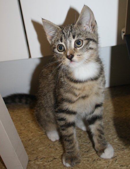 Liten kattunge på ca 10 uker. Korthåret, brun og svart tigret med hvit.