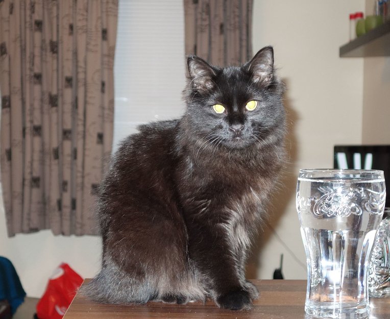 Ca 6 mnd hannkatt som ikke er kastrert eller chipmerket. Langhåret, men ikke veldig tykk pels. Veldig tynn og liten. Veldig tykk hale og hårete ører. Antydning til hvit pels midt imellom forbeina, ellers helt sort/mørk. Veldig sosial selv imot fremmede. Tydelig vandt med innendørs kattetoalett/kattesand. Ikke ID-merket og uten halsbånd.