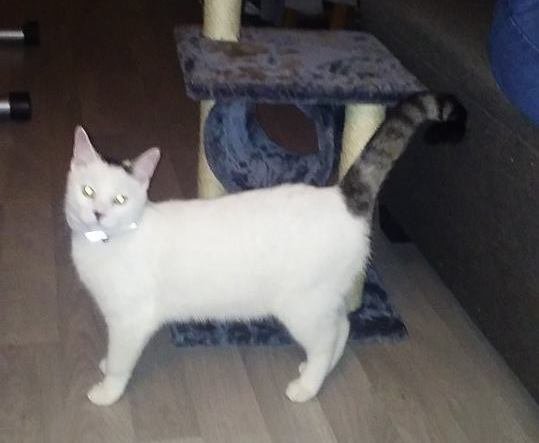 Den er kvit korthåret med svart flekk oppå hodet og svart hale med tiger striper på.