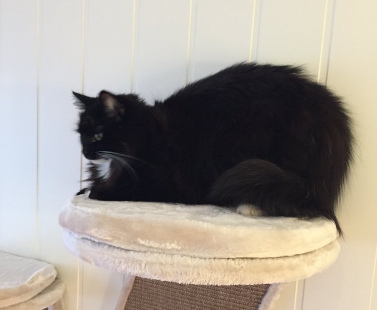 Hvite sokker på bakbena. Hvite tær på frambena. Hvit under hake. Litt hvitt på mage og bryst, resten av pelsen er svart. Langhåret. Stor til hunnkatt å være. Sky og forsiktig. Små ører i forhold til kroppen, lange værhår. Hun kan være skravlete. Leken.