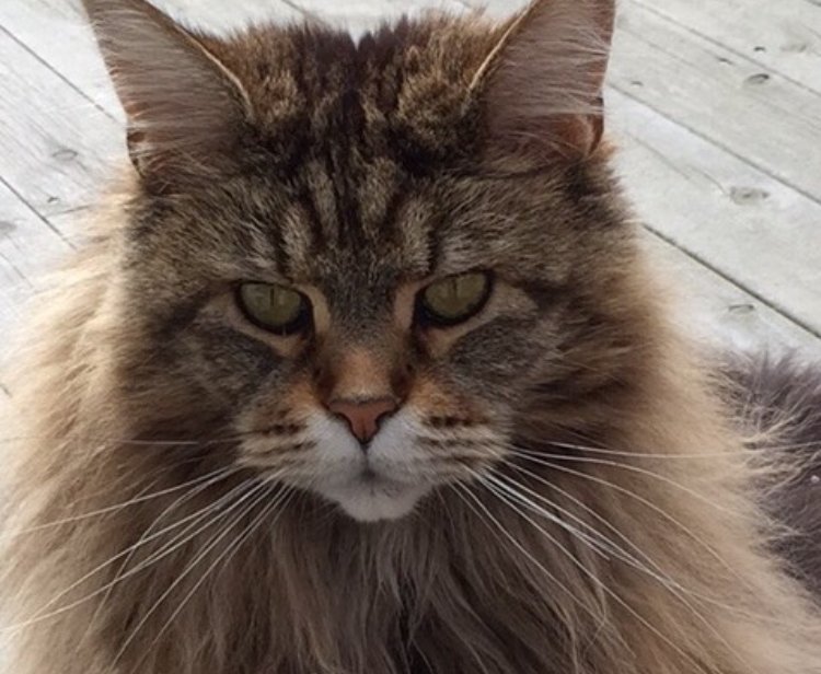 Hun er en relativt stor Main Coon, fin pels, brun/beige farger(Brown Tabby), stor bustete hale, litt lutete gange, spisse gaupeaktige øre( som denne rasen har), litt redd fremmede(folkesky).
