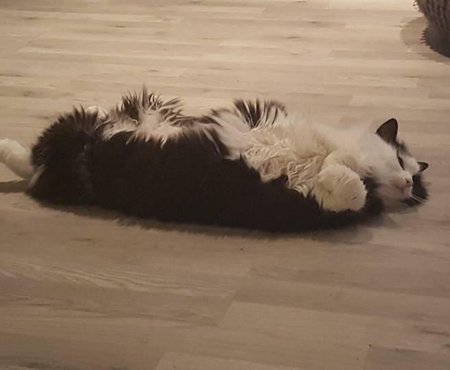 Hun er svart og hvit, veldig myk og god. Har to hårløse flekker under haken og ved øret pga floker.
