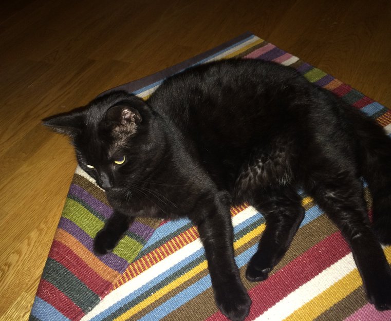 Sort katt, middels stor, 3 år gammel. Gule øyne og en liten hvit flekk på brystet. Litt skeptisk men sosial og nysgjerrig. Reagerer ofte på navnet sitt, Tistel.