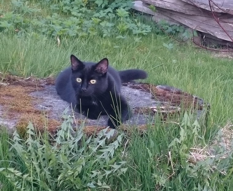 Ikke sett han siden. Har faste regelmessige rutiner sjelden ute mer enn 2-3 timer av gangen. Solo lyder navnet sitt. Er veldig kosete og trygg med folk han kjenner. Etter hva vi har sett litt skeptisk og skvetten. Han er en liten hannkatt ca 4 kg, for det meste sort pels med litt hvitt i brystet og litt under magen.