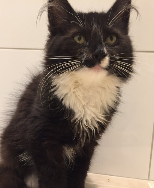 Svart liten katt med hvit pels under haken og på alle potene. Har akkurat blitt sterilisert, så hun har et arr på magen. Hun er veldig kosete og maler kjempehøyt.
