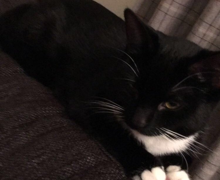 Molly er en liten katt på 9 mnd svart med hvite poter og hvit på magen.
