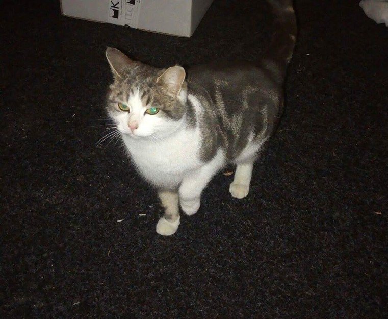 Katten dukket opp sulten, fikk mat og varm drikke. Siden har den kommet med jevne mellomrom. En liten jentepus, ca. 1 år, liten av vekst. Hvite bein og buk, grå/svart/ marmorert/stripet på rygg og sider, mørk hale. Ikke kastrert, høyst sannsynlig fra en gård i nærheten, men ikke ivaretatt. Har selv 2 katter, og ønsker ikke flere.