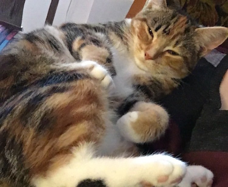 Liten hunkatt. Brun, sort, oransje og hvit. Hvite sokker på alle bena, med noen få fargeflekker. Har også fargeflekker under poten. Veldig kosete og snakker mye.