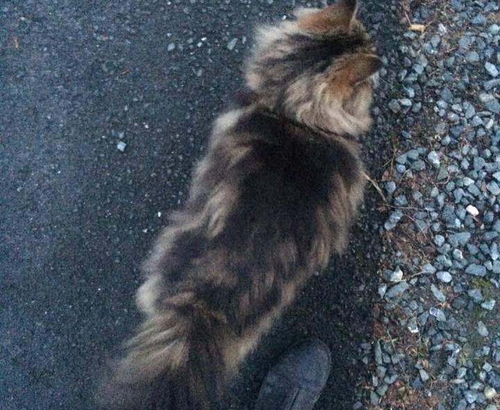 Katten vandrer rundt i Møllenbergområdet, veldig flokete i pelsen sin. Den er veldig kosete, mjauer masse, men liker ikke at jeg tar den med inn. Slukte to bokser våtfôr, så jeg mistenker den har gått ute en stund.