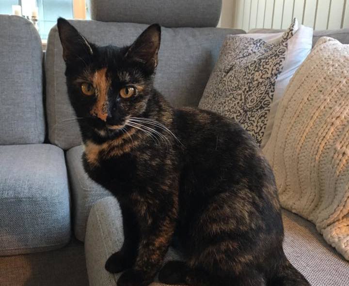 Katten er ca ett år gammel, og er ikke så stor i vekst enda. Farger: tricolour, mest sort, litt oransje/gul/brun og hvit. Hun har en oransje stripe på den ene siden av ansiktet. Halen er sort med brunt/oransje i pelsen. Hun elsker å klatre i trær og å gjemme seg på mørke steder. Hun mjauer ganske lavt. Blir plystret inn og kaldt Lurva eller Pusen.