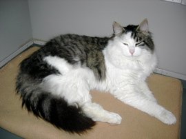 Stor hvit semilanghåret hannkatt med tigerstripede flekker. En rund flekk på den ene skulderen (vises ikke på bildet)
