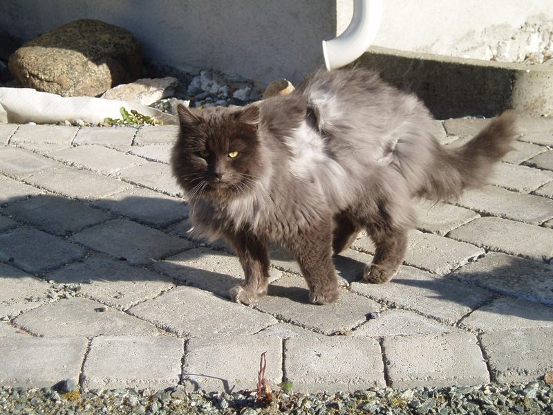 Blågrå, langhåret katt. Veldig kontaktsøkende. Mjauer lite. Forholdsvis liten av vekst. Virker til å ha vært ute en stund, men er ikke blitt sky av den grunn.