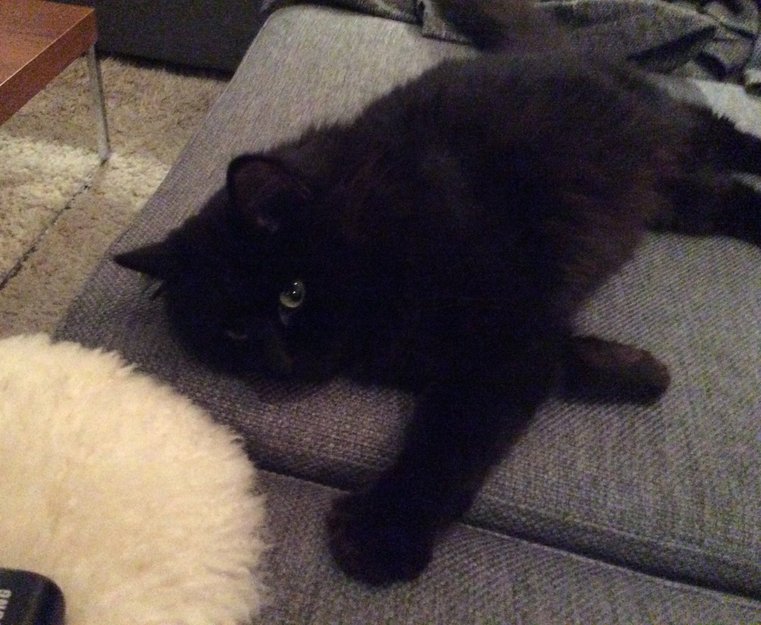 Sort langhåret, men med 5 hvite hårstrå i brystet og et par hvite hår i halen. Gule store øyne. Enten er dette en veldig liten hunnkatt, eller hun er ung ennå. Ekstremt kjælen.