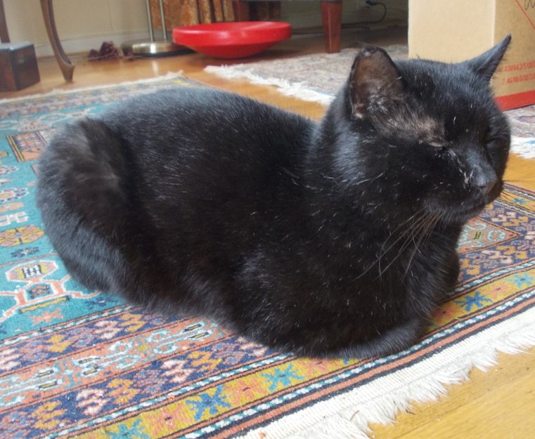 Helsvart tung, kraftig hankatt. Liten hvit flekk på magen.