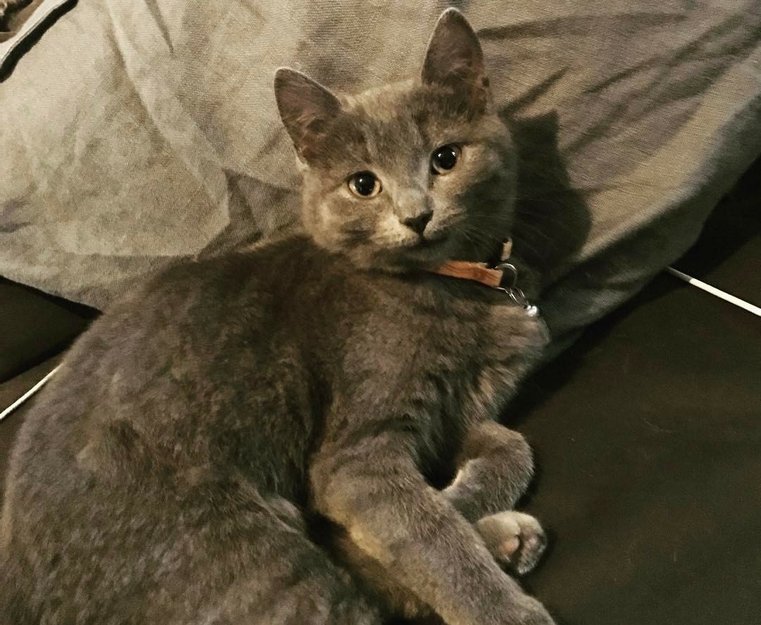 Helgrå, 6 mnd, barbert og sting under magen fra sterelisering forrige uke.