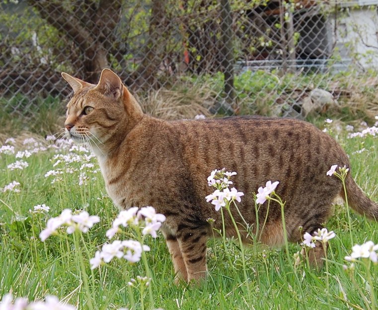 Katten er brun med mørkebrune prikker (spotter) og er litt hvit på brystet og ved snuten. Han kan mjaue/snakke en del og har ganske høy mjauing.