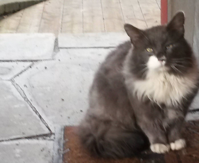 Katten har mjauet utenfor huset vårt i mange uker. Ikke helt sikker på hvor lenge. Den har kommet til terrassedøren som den vil inn. Jeg trodde først den så fin ut, men så fulgte den med katten vår inn, og kastet seg over maten i vindfanget. Etterpå var den desperat og hoppet opp på dørklinka og åpnet døra for å komme inn og spise mat.
