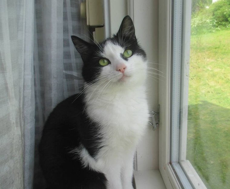 Svart og hvit hunnkatt kastrert og ID-merket. Litt sky, men veldig kosete. Opp ned V markering i ansiktet, med hvit under og svart på ørene. Ekstra svart avlang flekk på øyet.