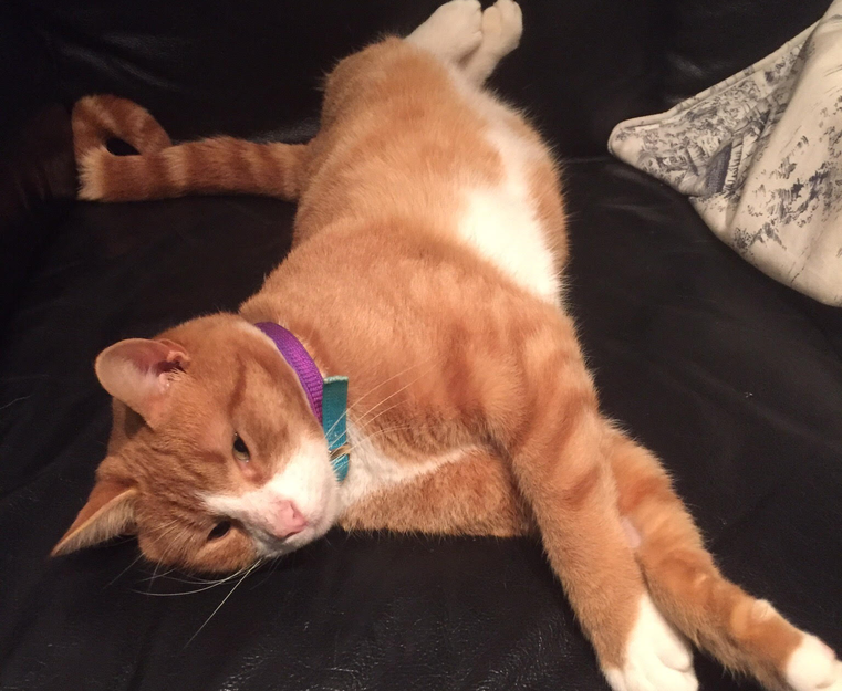 Lawrence er chippet, kastrert og har halsbånd med bjelle (mørkere farge enn avbildet). Han reagerer på navnet sitt og elsker lyden av "Dreamies"-pose (kattesnacks som fås kjøpt på vanlig butikk) som ristes.
