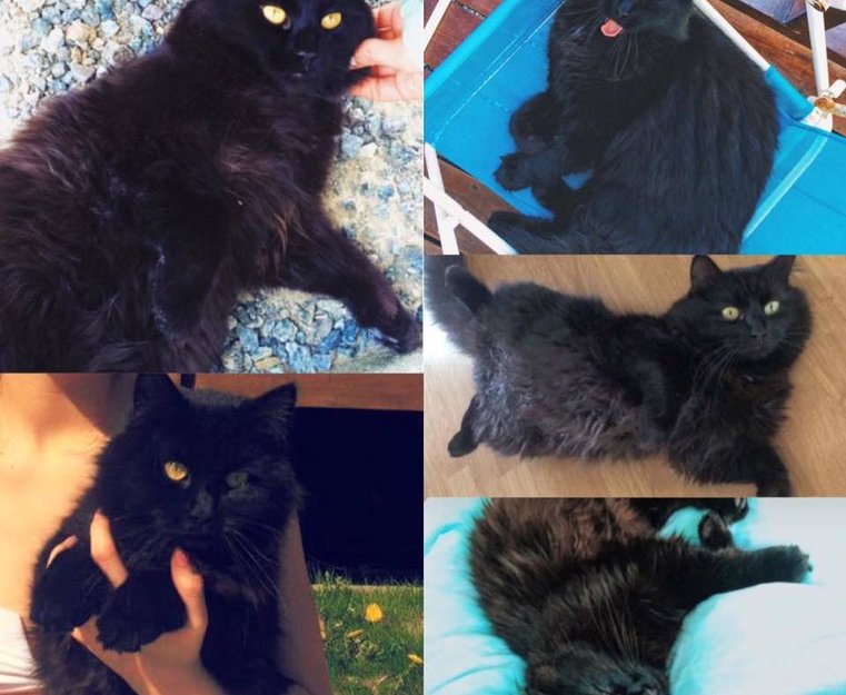 Helt sort med en liten stripe på halsen. Lubben og god, noe lat. Han legger seg ner hvor som helst, hvertfall innendørs. Glad i all mat, spesielt tunfisk. Mjauer ikke stort og er aldri sur og lei. Alltid i humør til å leke. 3 år gammel.
