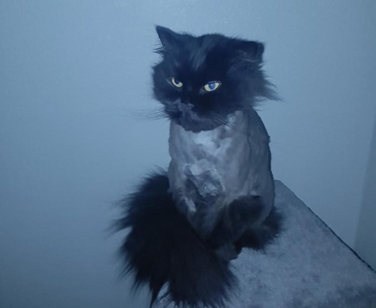 Lyder navnet pusil, sort langhåret katt som nå er kort klippet på kroppen.