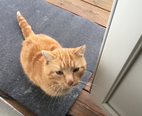 Liten gul hannkatt dukket opp i mars 2016, var borte i flere måneder, men har nå dukket opp igjen. Er sky men kontaktsøkende.