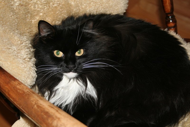En sort hushatt,med hvitt parti på halsen og litt hvitt på en fot. Er langhåret.