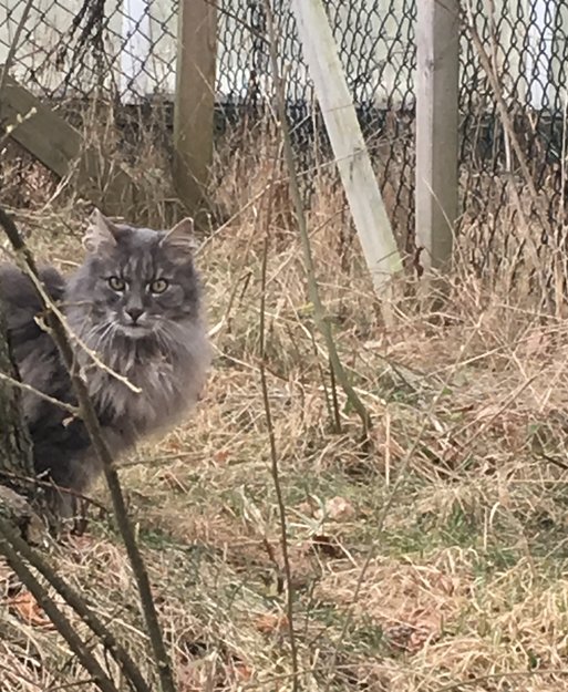 Blågrå langhåret pels, litt tigret, flott lang hale, gule øyne . Små poter. Tror det er en kastrert hannkatt men er litt usikker.