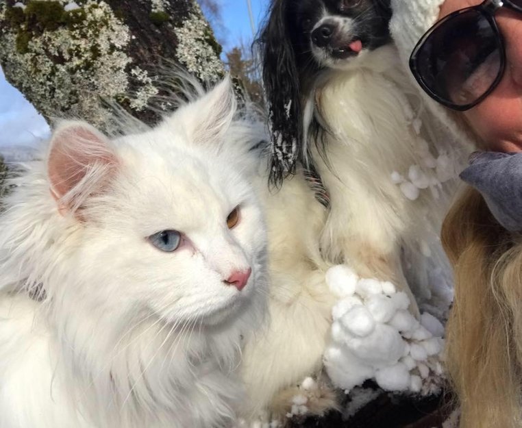 Han har et blått øye og et brunt øye! Et rødt halsbånd med bjelle og telefon nummer på!
