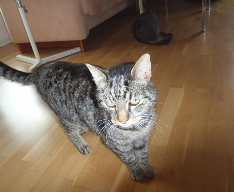 Den kom inn via balkongdøren en dag. Og har vært i området i ca. 1 år. Den er sky, men liker å få kos og ikke minst mat.