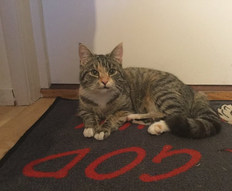 Den forholdsvis lille, unge pusen, som vi tror er maks ett år gammel, dukket opp i et boligområde på Fagerstrand 10 mars. Hun ville gjerne inn. Det fikk hun ikke, men ble værende i området og ville senere inn i et annet hus, som hun heller ikke fikk lov til. Lokale søk etter eier har ikke gitt resultater. Nesoddkatten har tatt vare på henne fra 19 mars. Hun er sosial, kosete og mulig drektig.