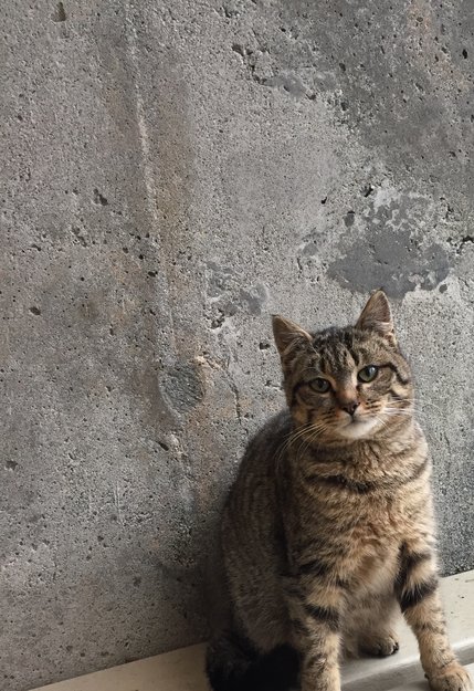 Ung hunnkatt(?) - ca. 6 mndr. Kjælen og snill, men litt sky. Vennlig mot mennesker og andre katter. Kort pels, små ører og kort hale.