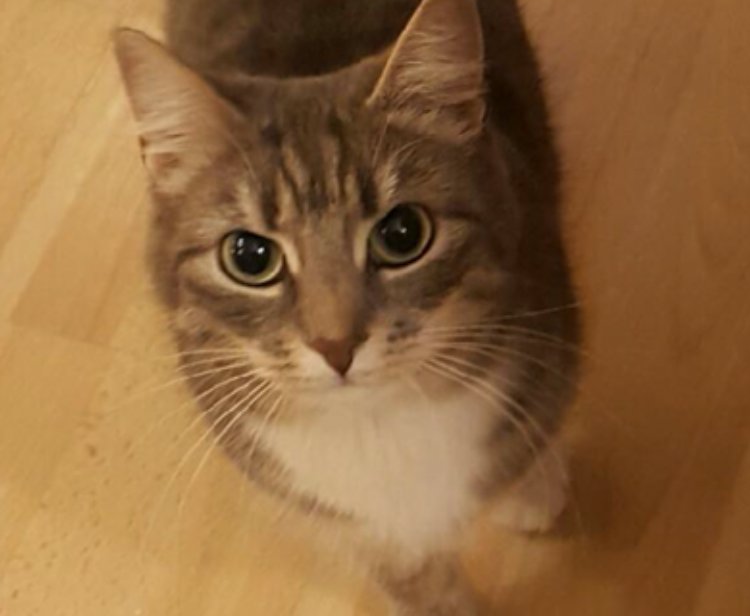 Gråstripete liten katt med hvite sko. Veldig nysgjerrig og smetter fort inn i garasjer/kjellere.