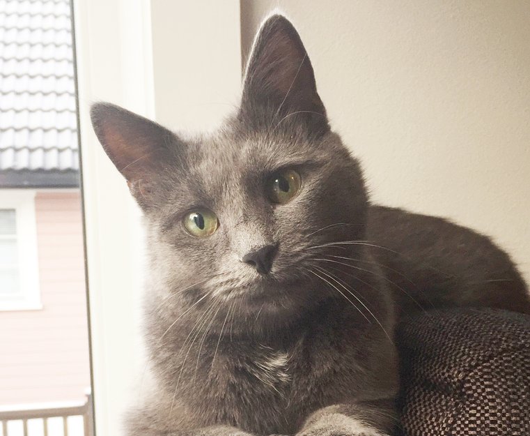Stor pusedame, sølvgrå pels med litt hvitt på brystet. Pus er veldig sky og veldig snill og kosete på utvalgte personer.