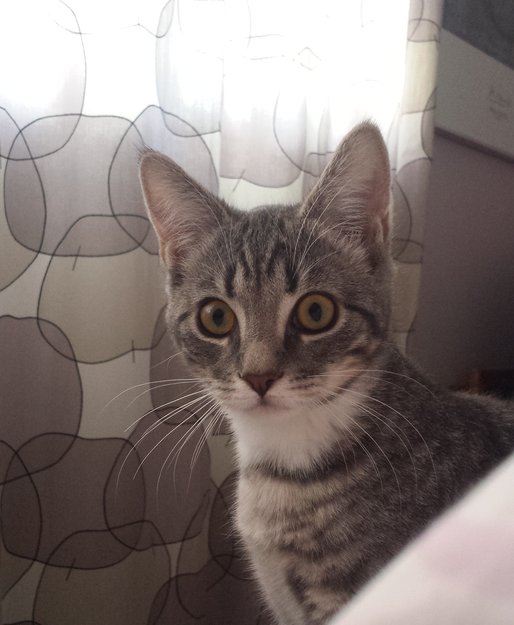Hun er 7 mnd, tynn og lang. Grå- spraglete/stripete. Litt store ører. Gul-brune øyne