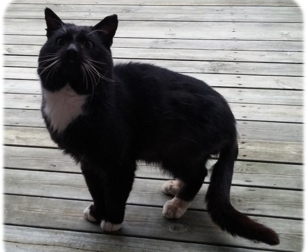 Katten har trolig gått her lenge, men fikk først kontakt med ham 16.03.17. Da han fikk mat, fikk jeg klappet ham, og satt på ham halsbånd med tekst og tlf. nr.