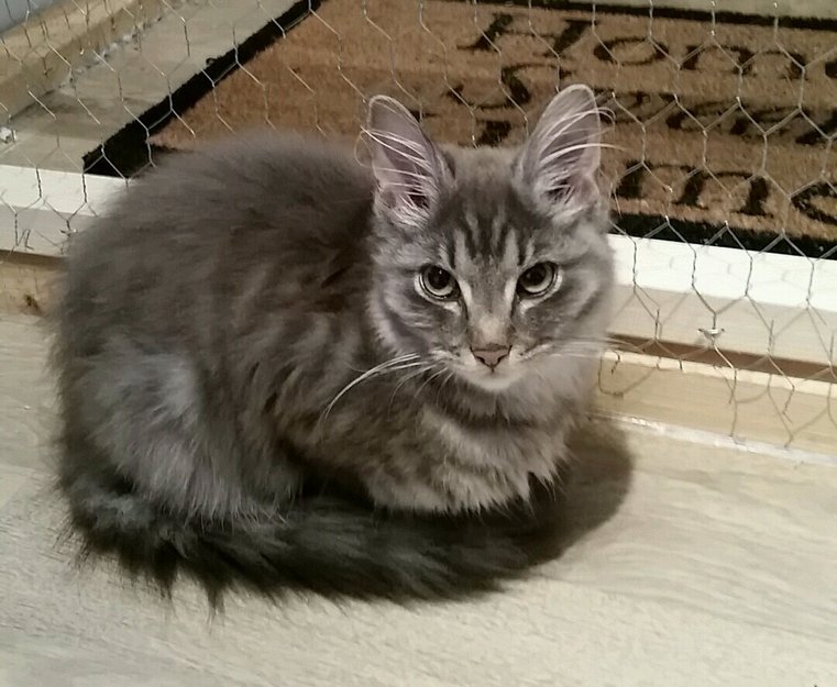 Grå-spraglete kattunge. Tynn og sky.