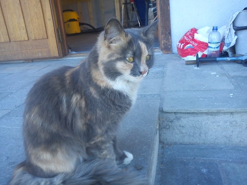 Kom til oss på natten, virker som om hun har gått seg bort. Virker som hun har en tendens til å traske med tungen litt ut. Hun har fått litt tørrfôr og vann av oss.