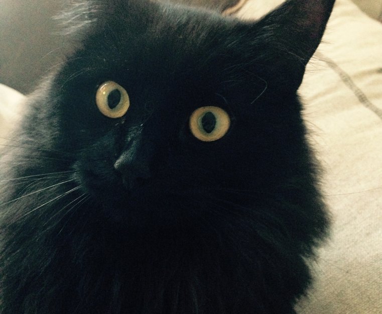 Han er helt svart og er noe koksgrå på magen. Har også et tynt lite hvithåret arr på bakbenet (ikke veldig synlig)