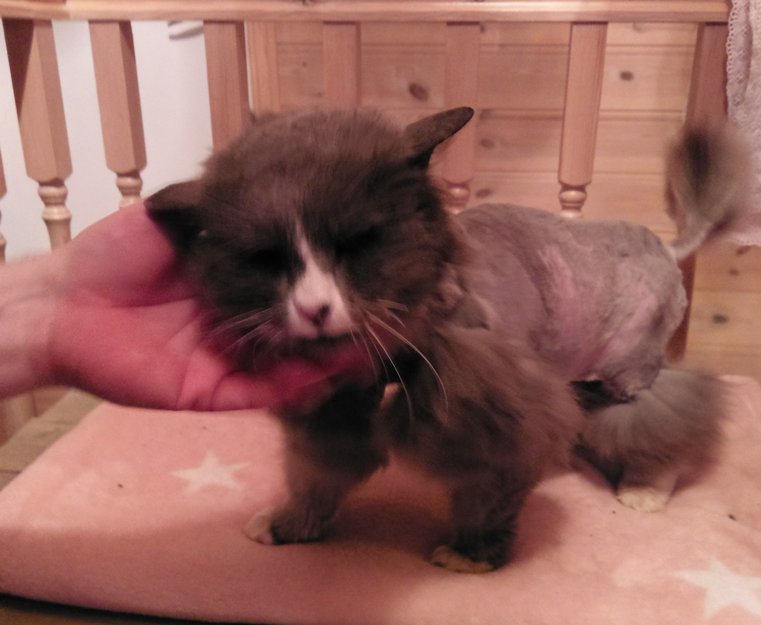 Oppdaget katten tilfeldig når den rotet i søpla. Har deretter prøvd å få den nærmere for å sjekke chip, og den har ila vinteren blitt tryggere. Har nå sjekket chip og den var ikke chippet, tok katten med til dyrlegen hvor den har blitt barbert(grunnet tover over hele kroppen), fått ormkur, middkur, og chip av Dyrebeskyttelsen. Har dårlige tenner, og må tilbake for å få trukket en tann. Dyrlegen antar at katten er ca 8 år.