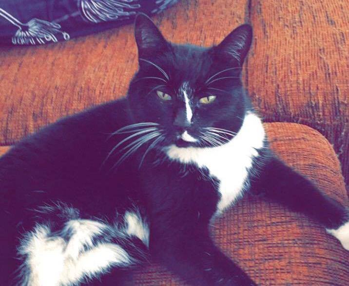Smal, hvit stripe oppover nesen, hvitt bryst og hvite sokker på labbene. Sterilisert. Trolig rundt 2 år. Ikke chip eller merke i øret. Svært kosete og trygg på barn.